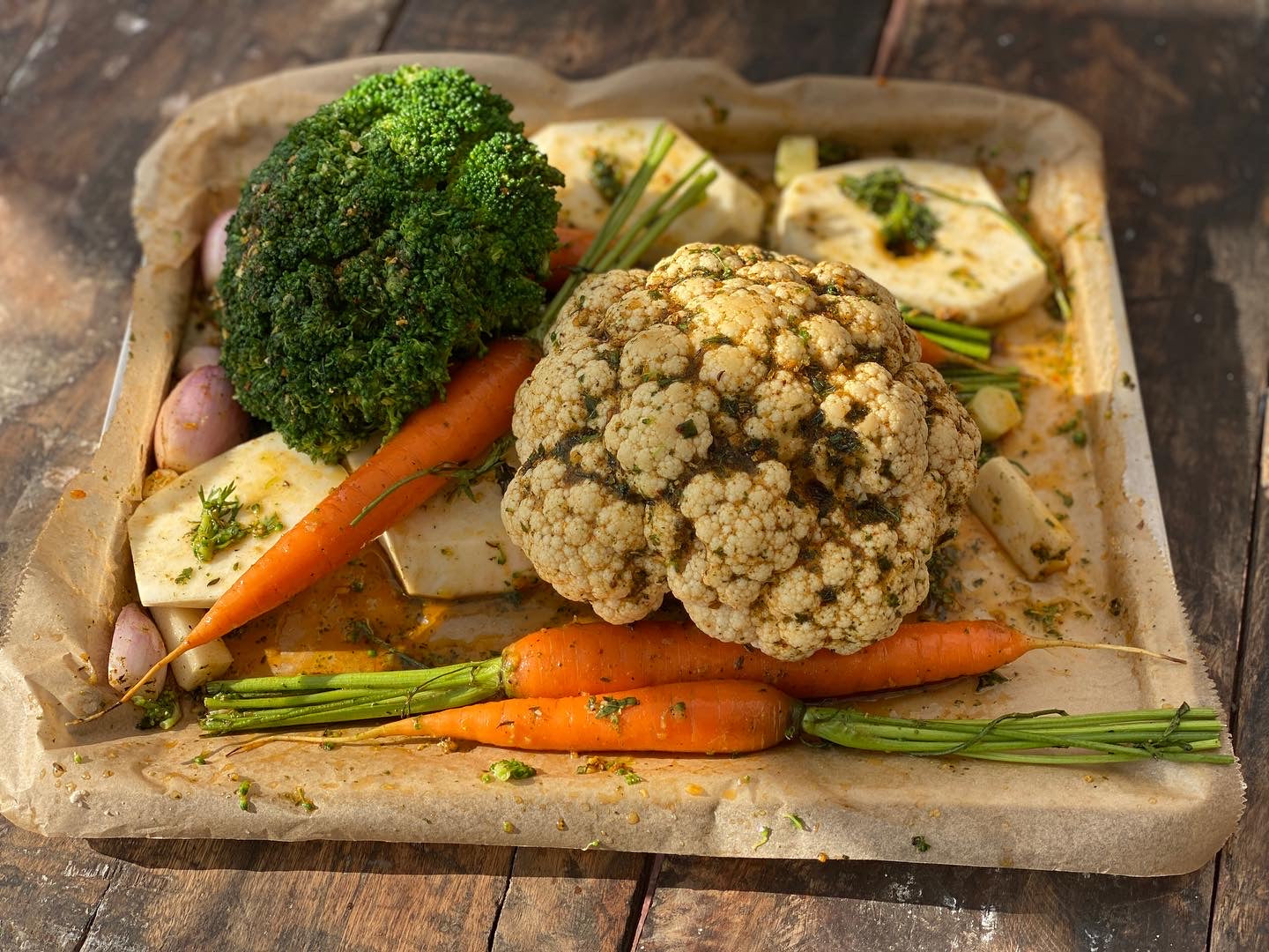 Den gewürzten Blumenkohl auf ein Backblech legen und im vorgeheizten Ofen bei 180°C Umluft